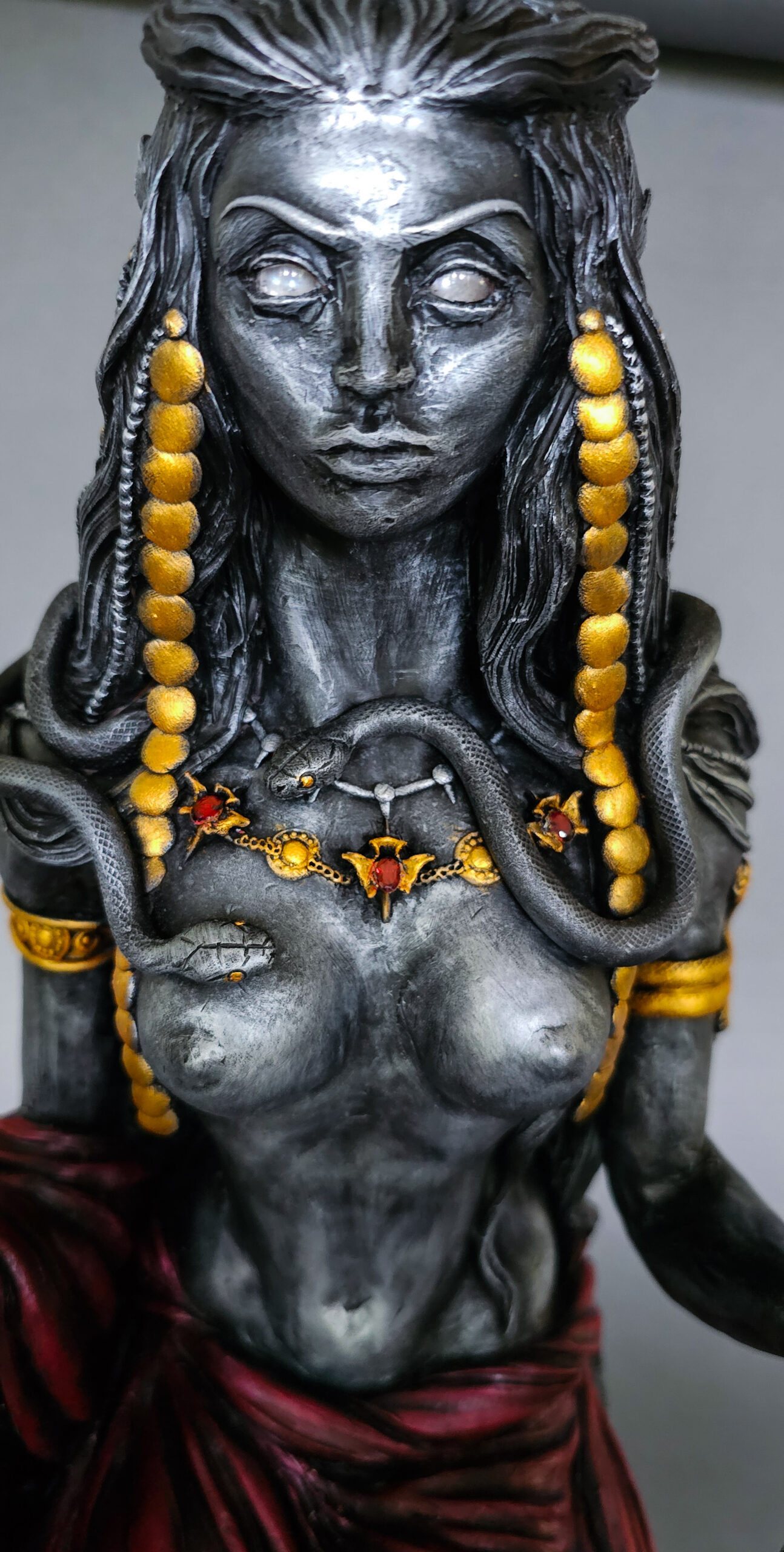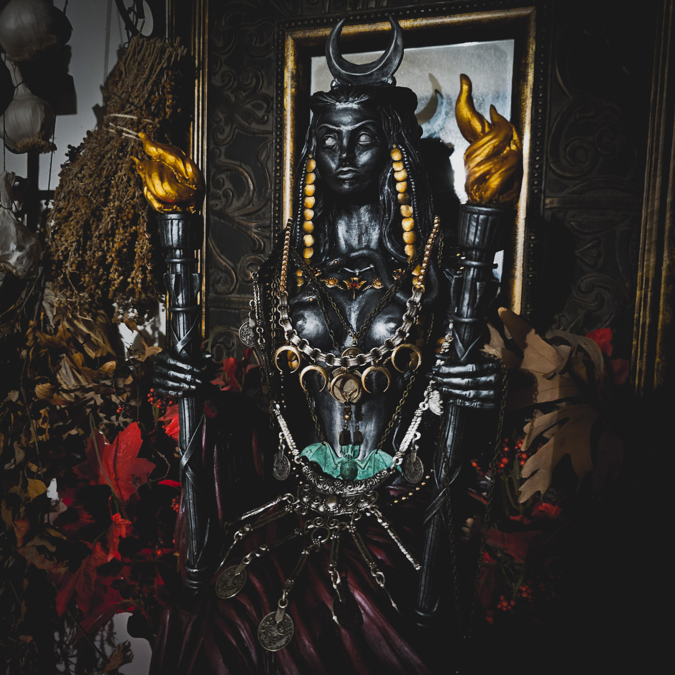 Her eyes are bright flashed moonstone, star garnet, and obsidian. She is set with genuine snake vertebrae and jewelry grade garnets. Her heart contains an amulet of datura, belladonna, henbane, yew, wormwood, bay, aconite, poplar, and oak anointed in oils, dog tooth, human bone, and a stone from a triple crossroads within a graveyard.