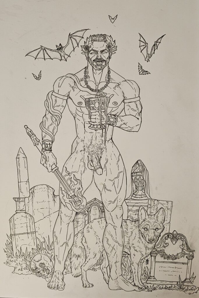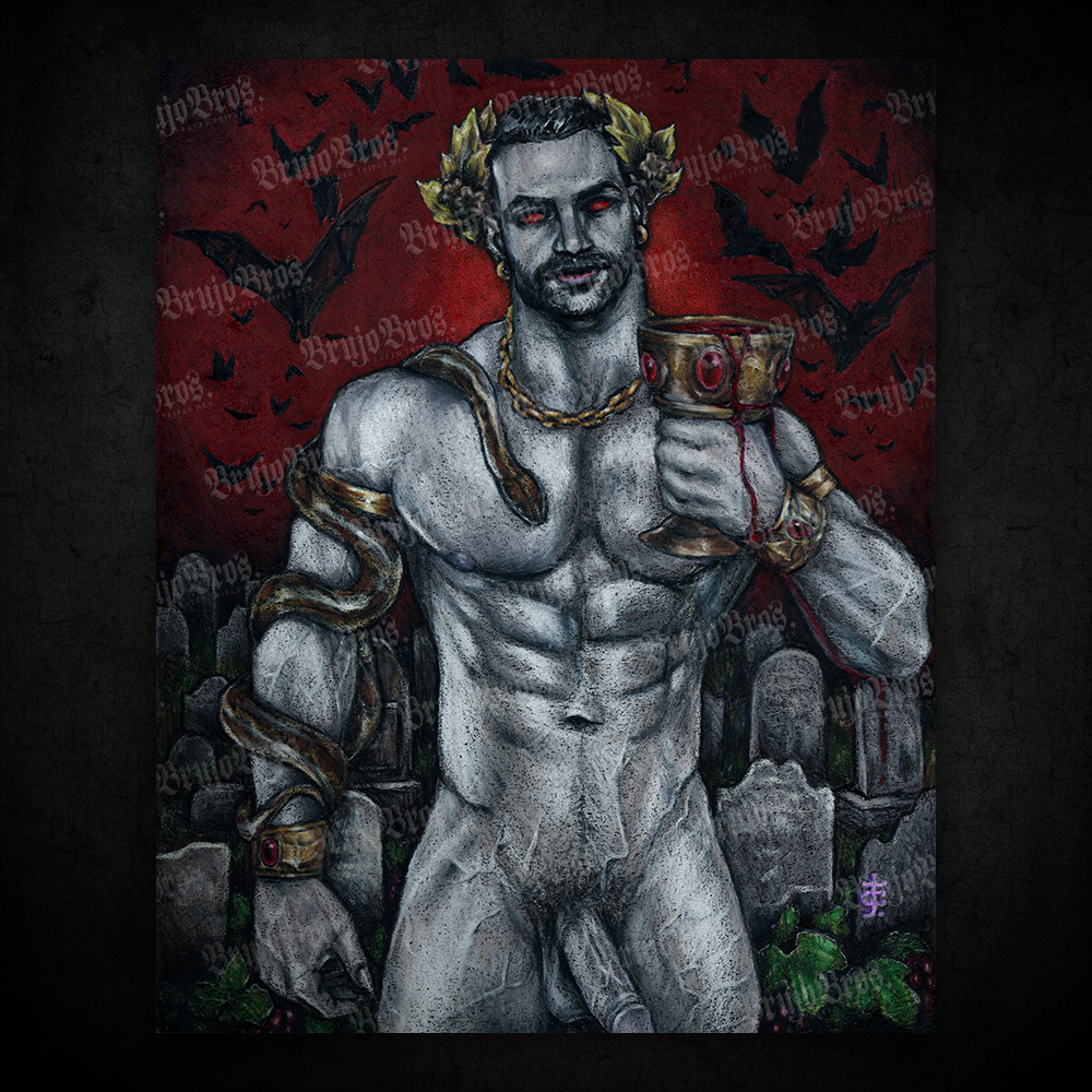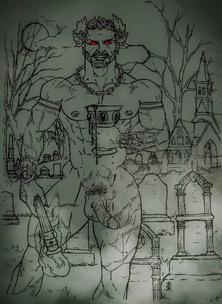 That leads to the question, what would an appropriate depiction of Zagreus look like? For one, according to Diodorus, in the 1st century BCE, He is the older of two distinct Dionysoi, and is bearded like men would have been of the day. Of course, as a God, He is well muscled, an ideal unattainable by most mortals. He can hold an inextinguishable torch, perhaps downturned, much like those on Victorian tombstones. This represents the immortality of the soul itself, that even after Death we endure. In His other hand, He holds a chalice of warm blood, sweet like wine. This represents the life-giving and life-sustaining powers of blood, a power that is said to be able to even bring back the Dead. This makes vampyric imagery appropriate.
