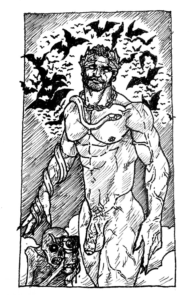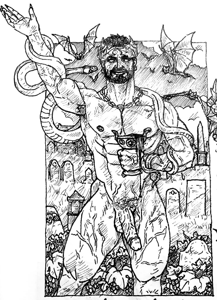 Zagreus as a powerful Underworld God persisted for hundreds of years, from that very first inscription from somewhere in the 5th or 8th century BCE, into the middle of the 4th century, where He retains dominion as an elevated Stygian God. He also sits on the liminal space between Underworld and Olympian, much like Hekate. Euripides mentions the “midnight Zagreus”, armed with Zeus’s thunderbolts. For a time, Zagreus was seen as the God responsible for nocturnal storms, rather than Zeus Who was more associated with the light of Day. In this same dialog, He is also still propped up beside Gaia, or Kybele, and celebrated with “red and bleeding feasts”. In fact, nocturnal orgiastic rituals filled with sexual carnality and dark witchcraft are a normal feature in the Zagreus cult, a reputation maintained up through the 5th century CE in “Dionysiaca’ by Nonnus mentions the “Egyptian Dionysos”, a name given to Zagreus due to His association with Osiris, and “nightly celebrations of mystic arts” and “magic hymns sung in wild secret languages” under the God’s patronage. He can be seen as a Vampire God, that life-force that flows in warm blood being sacred to Him. Blood as life-giving fluid was important in ancient witchcraft, in fact it was necessary to facilitate communion with the Dead in Necromancy. Fresh, living blood mixed with poisonous herbs injected into the veins of cadavers while reciting spells and incantations to Gods such as Zagreus and Hekate could restore temporary life in order to obtain oracles from the soul that has become privy to the secret workings of the Universe, able to see past, present, as well as future. Necromancy is an art sacred to Zagreus in that it is a temporary expedition of His cycle of Death and Rebirth, albeit temporary.